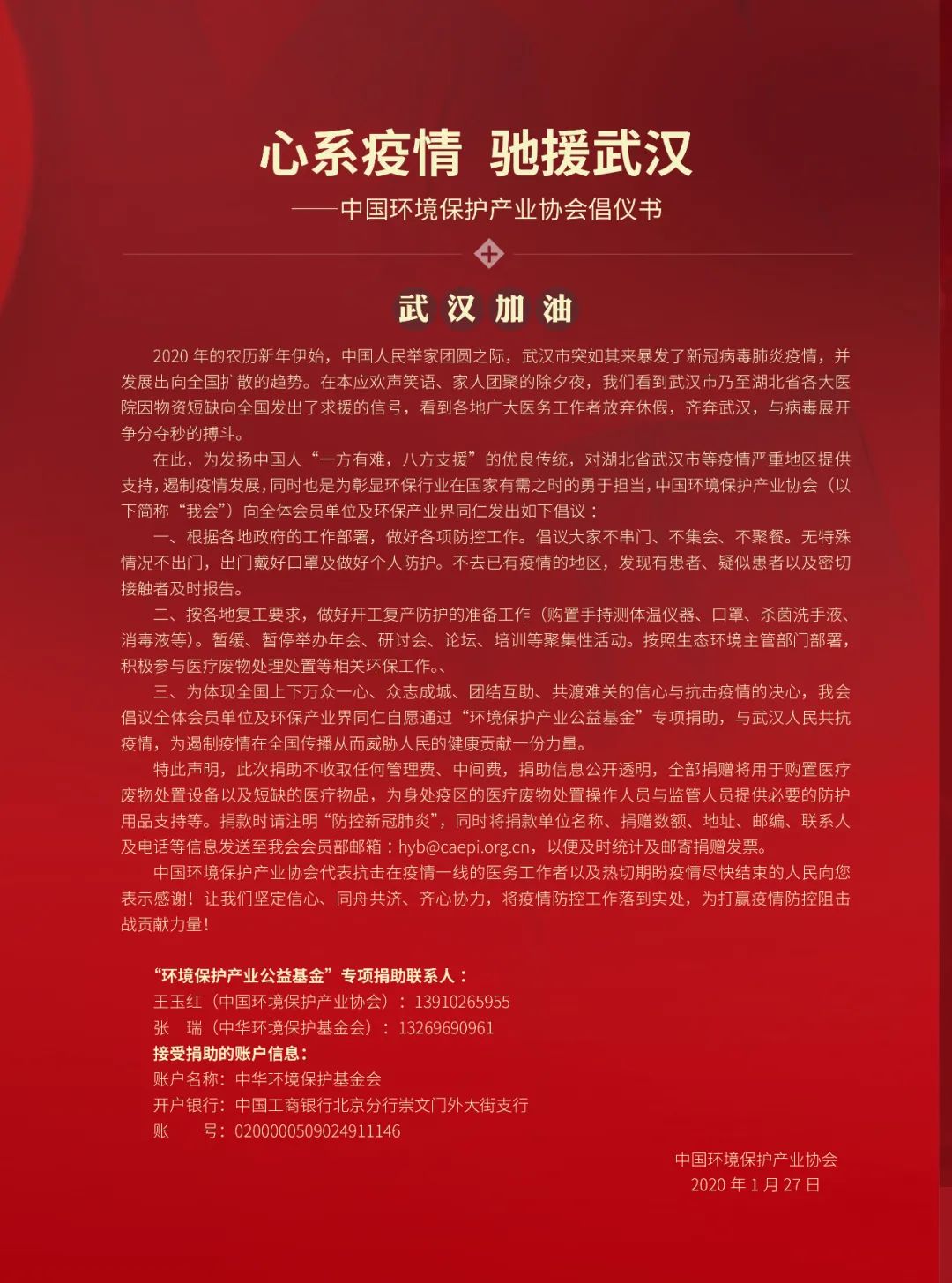 4、1月31日,為發(fā)揚中國人“一方有難,八方支援”的優(yōu)良傳統(tǒng),對湖北省武漢市等疫情嚴重地區(qū)提供支持,我會向全體會員單位及環(huán)保產業(yè)界同仁發(fā)出發(fā)布 “心系疫情馳援武漢——中國環(huán)境保護協(xié)會倡議書”,籌集捐款約290萬元,購置65輛醫(yī)廢轉運車,支援湖北抗疫。